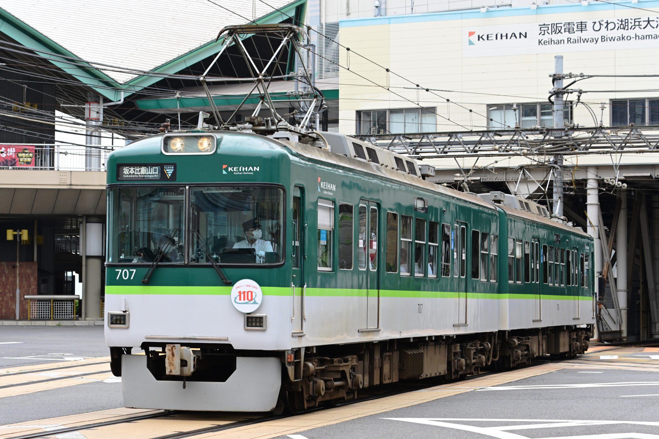 「開業110周年」のヘッドマークを掲出する京阪電気鉄道石山坂本線の707+708 DSC_7773a