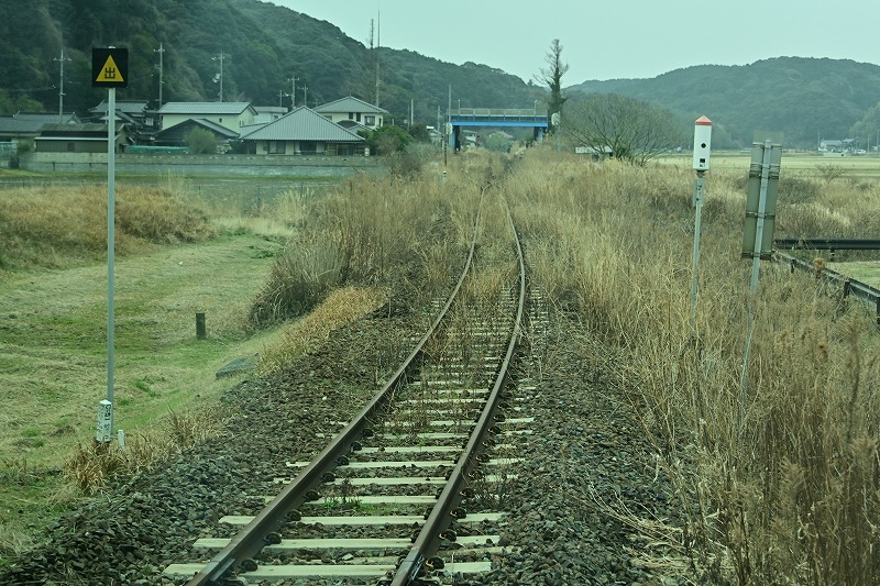 人丸駅と滝部駅の間が、この粟野川橋梁復旧工事で不通になっているので、線路には、草が生え放題で「廃線跡か!?」と思わせるような状態でした。(投稿写真:阿川駅の長門市よりの様子)
