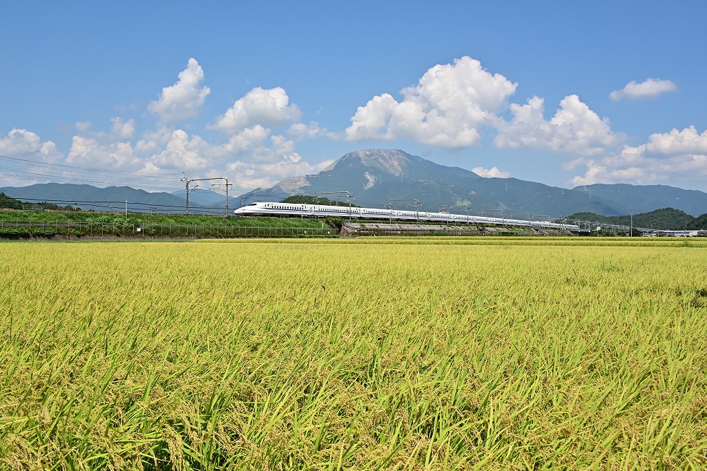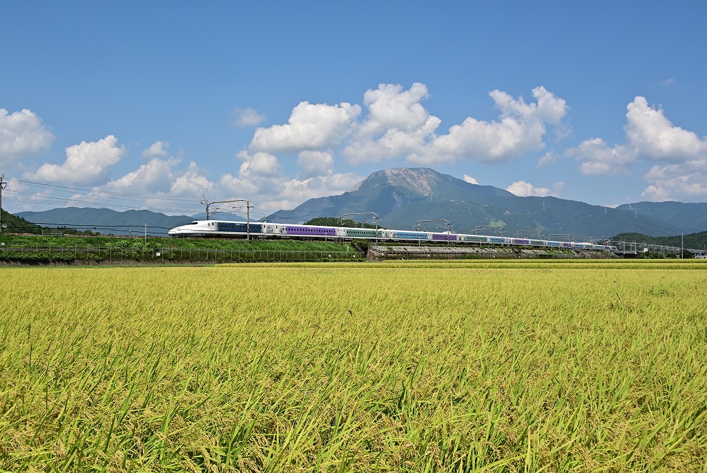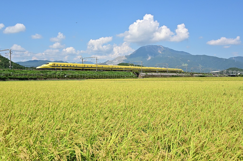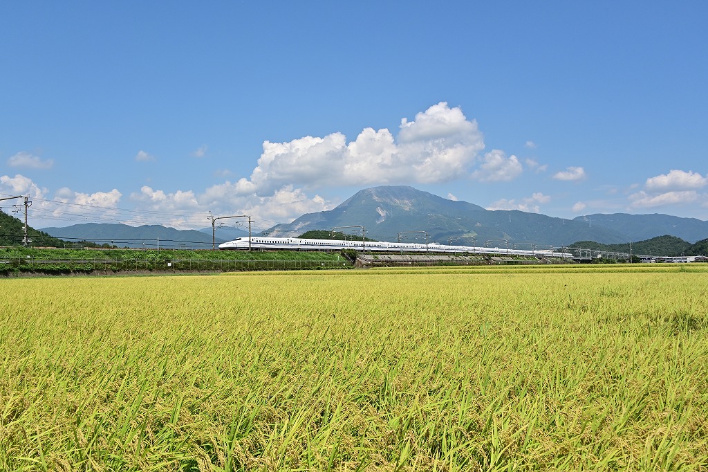 今日の一番の撮影目的であるドクターイエロー。手前に稲穂、後ろに伊吹山を配して撮りました。2025.8.19 米原~岐阜羽島間