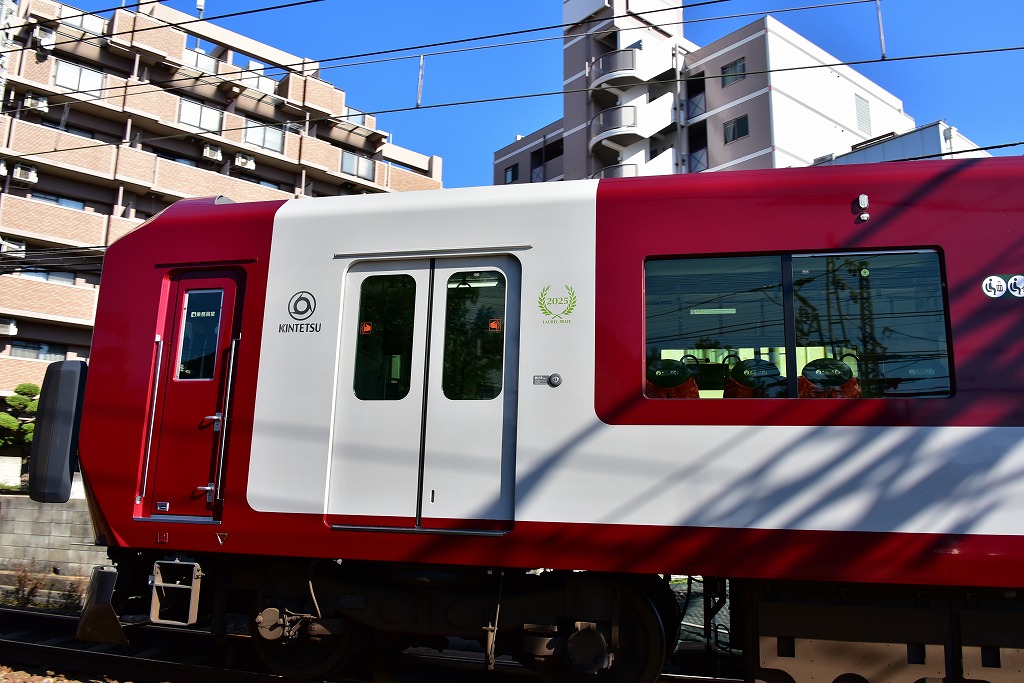 受賞を記念して、8A系01編成と8A系21編成に「ローレル賞」のシンボルマークが標されました。写真は、「ローレル賞」のシンボルマークを表した8A101です。ドアー横にも標されています。11月16日に授賞式があり、その日から標示されて走っています。 2025.11.19 大和西大寺駅~平城駅間で撮影