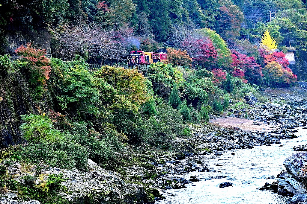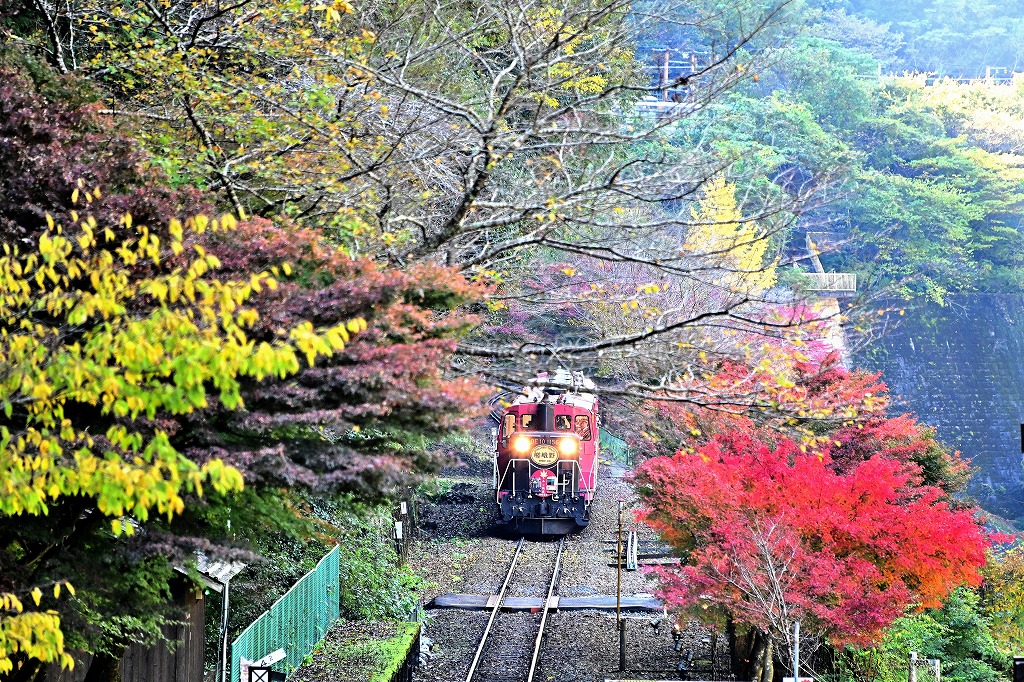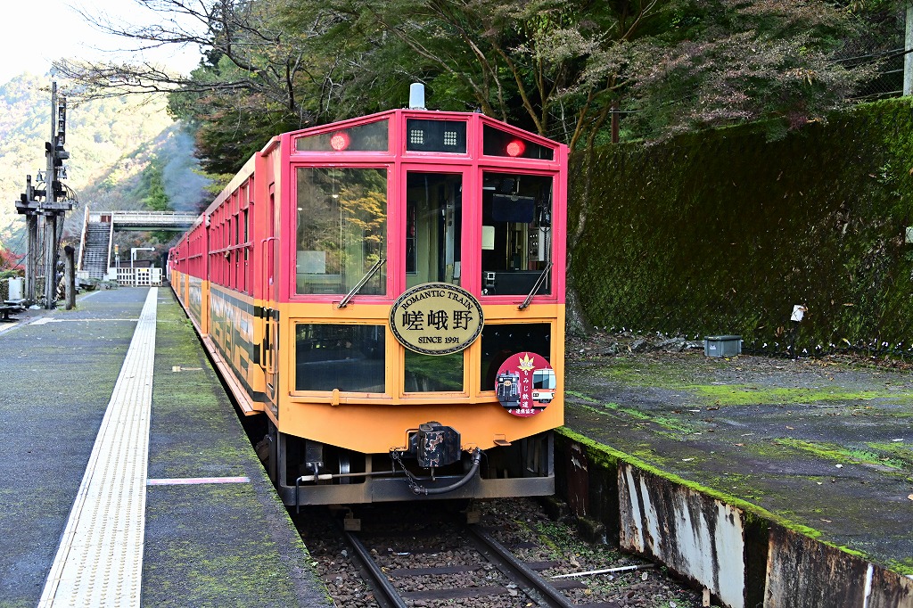 保津峡駅に進入するトロッコ列車です。「もみじ鉄道」のヘッドマークを掲げて、叡山電鉄との連携協定をアピールしています。色づいたもみじの横を走ります。