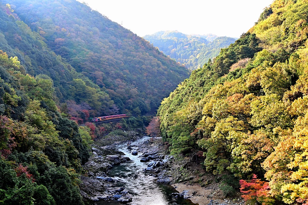 トロッコの保津峡駅です。旧山陰本線の保津峡の駅ですが、2面1線になっています。保津川には、保津川下りの船が流れていきます。対岸の紅葉は旬でした。このトロッコ列車も、2027年の春で世代交代です。
