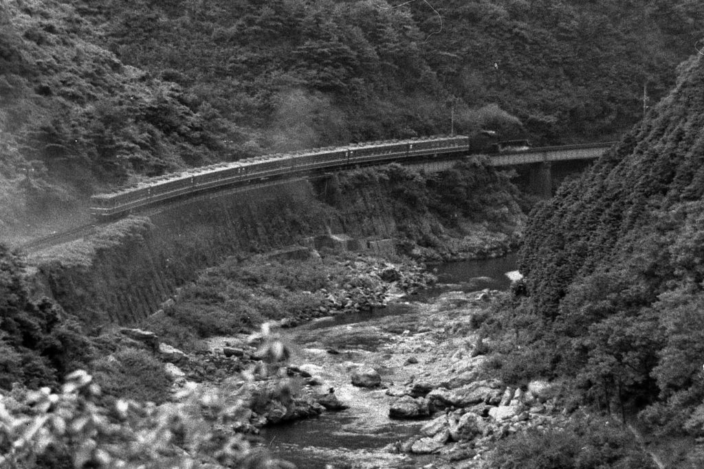 昭和45年頃の写真です。SL(C57)が12系車両をけん引して、山陰本線を下って行きます。前の写真と同じ場所です。川の石は変わっていませんね。