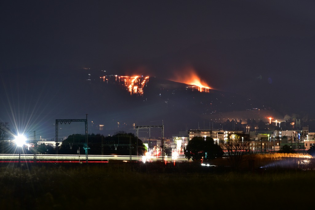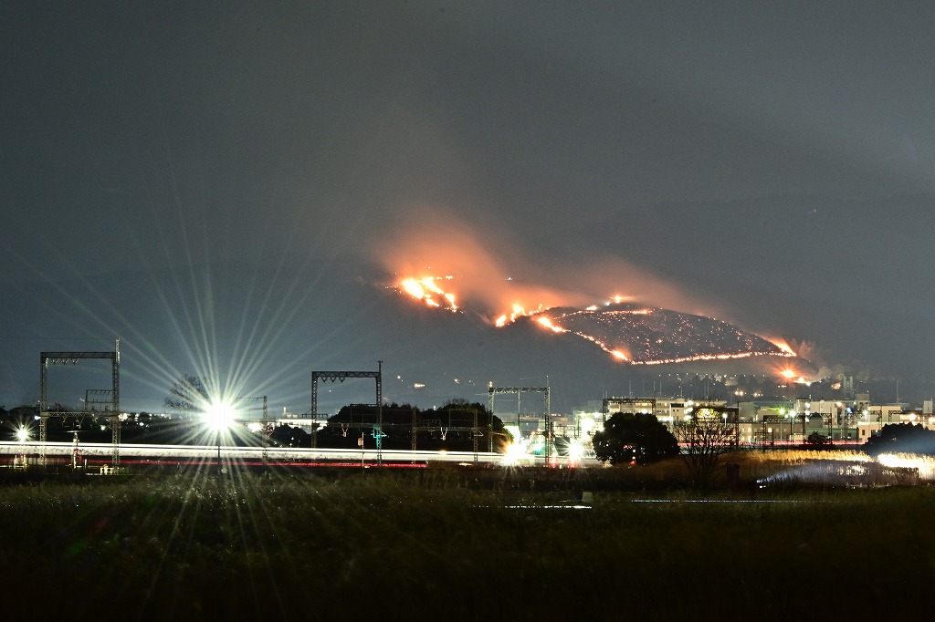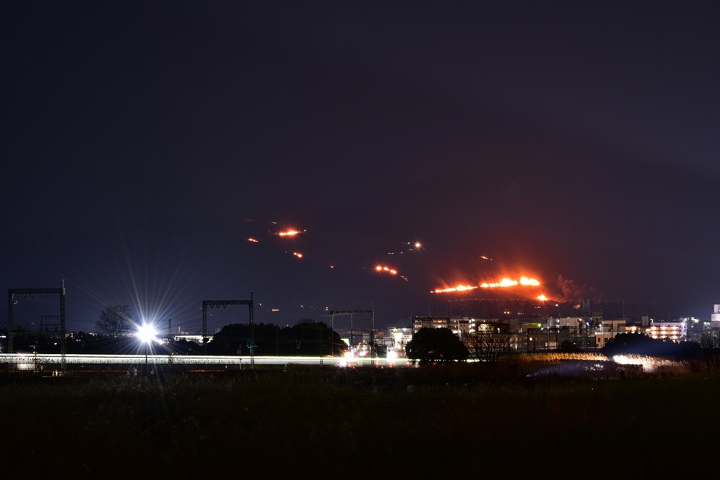 しばらく雨が降っていないので、「今年もよく燃えるだろう」と予想はしていたのですが、予想以上によく燃えて、昨年以上に短時間で燃え上がってしまいました。しかし、その短時間でも、近鉄電車の光跡と山焼きが丁度合ったので、「写真的には良かったかな?」って思っています。