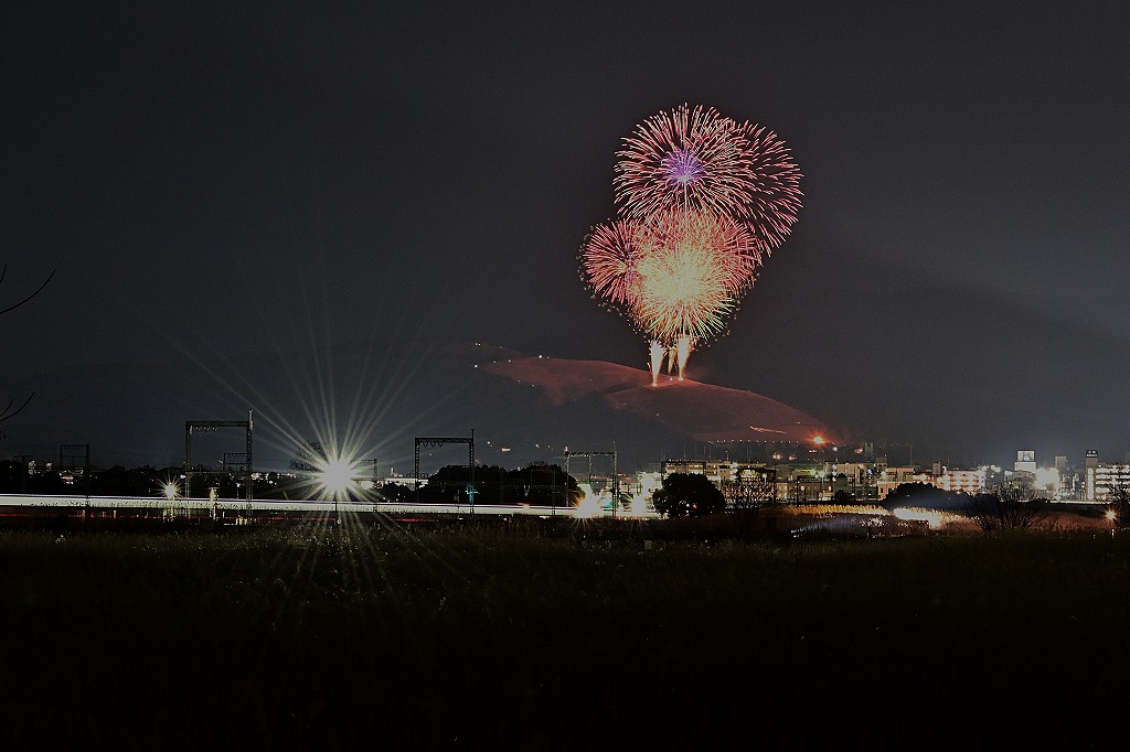 若草山の山焼きの始まりを知らせる合図である花火が打ち上げられました。一直線に伸びるのが、近鉄電車の光跡です。最後の投稿写真まで、同じように入れました。
