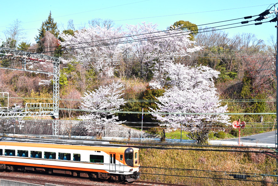 同じ位置での横位置撮影です。春めく中、近鉄特急が嬉しそうに走っているように見えますでしょうか。