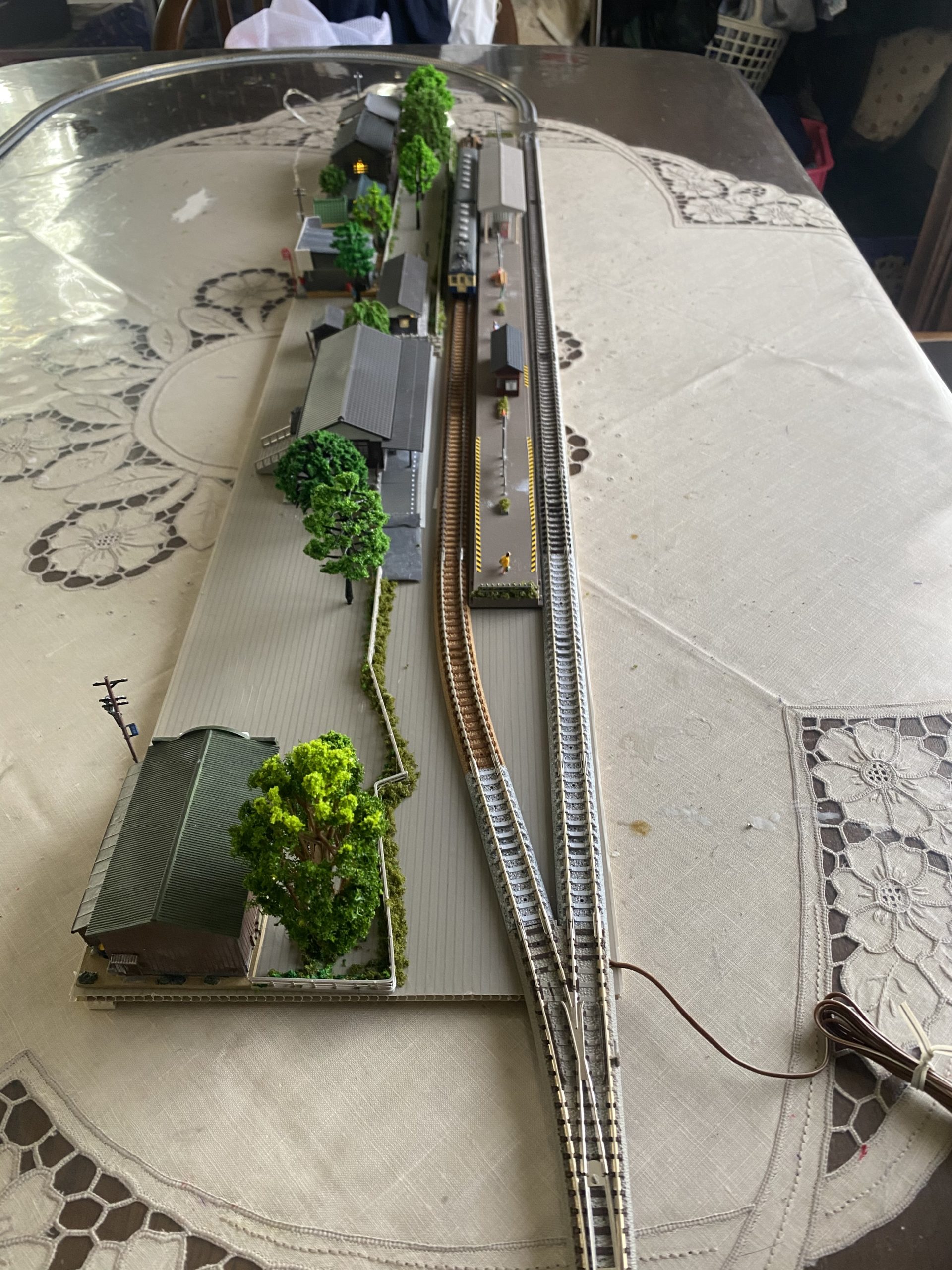 コロナ禍の緊急事態宣言発令で自宅待機を余儀なくされたGWでしたが、何気なくNゲージ車両のメンテナンスを思い付き昔の道具箱を引っ張り出して来たら、制作途中のプラ模型の建物が出て来ました。KATOの機関区の建屋でしたので、仕上げて行く内にジオラマにしてみようとホームセンターでプラダンを買ってきて20㎝×90㎝の細長いサイズにカットしました。それからAmazonで色々な資材を購入して、イメージを自分が学生時代を送った《昭和40〜50年代の国鉄ローカル駅》に設定してミニジオラマを制作しました。どうせなら、Nゲージ運転会でお座敷レイアウトの一部として接続すれば【モジュールレイアウト】として皆んなにも見て貰えると思い、気合を入れて作りました!車両を走らせたスナップ写真をご覧下さい。今回は国鉄飯田線をイメージして、スカ色のクモハ51系や165系急行電車、ED19貨物列車が登場します。