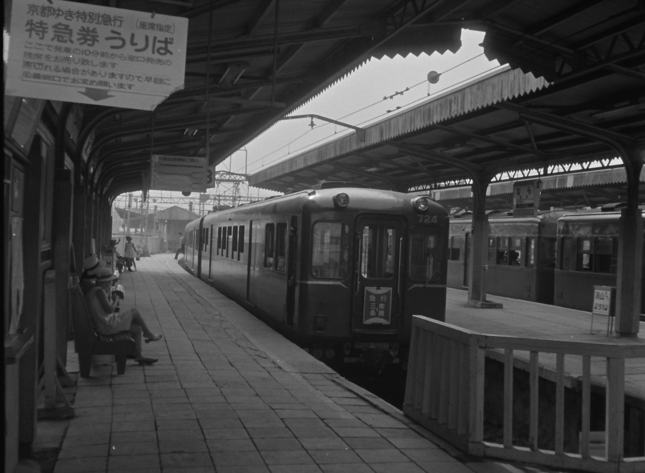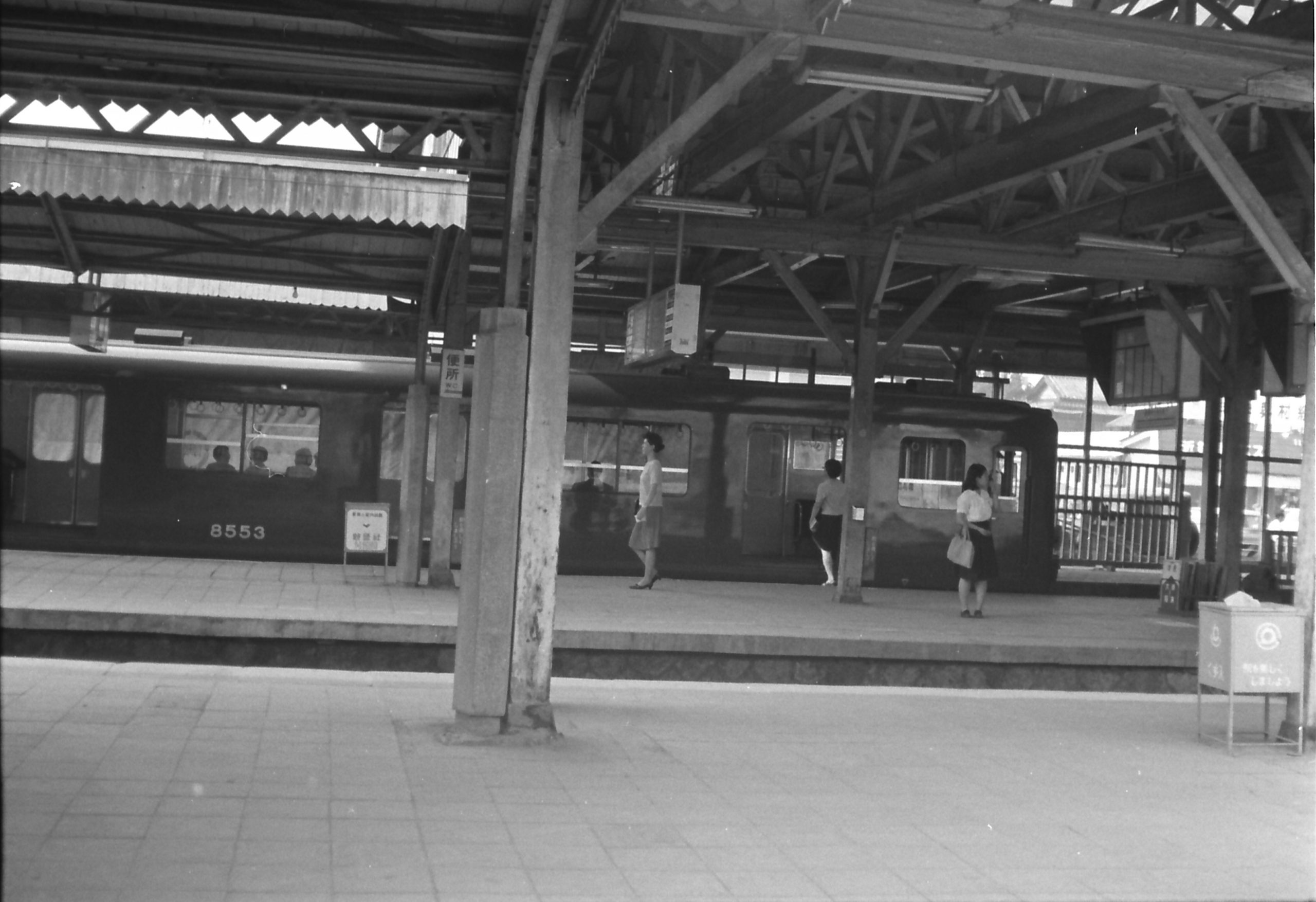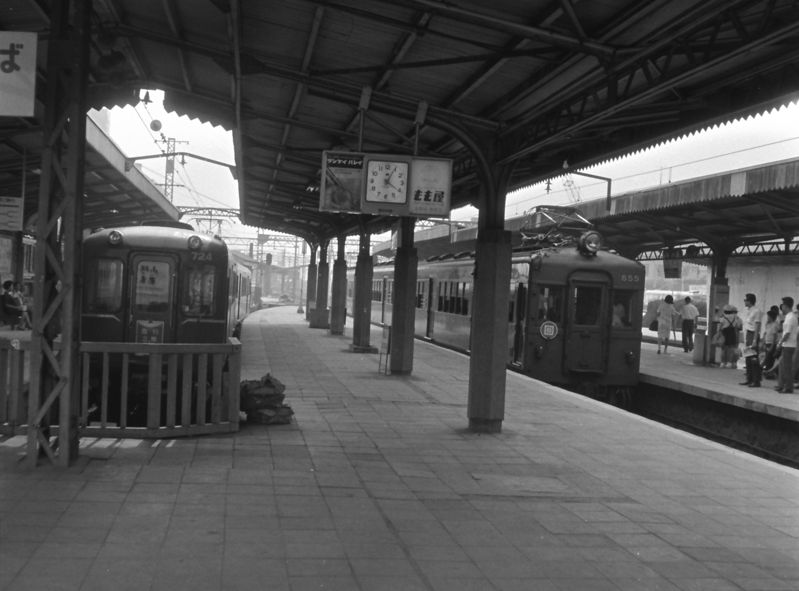 近鉄奈良駅との最初の出会いは幼稚園時代。遠足で奈良公園を訪れたときに乗っていた電車がそれまでまちの中を走っていたのが、車窓にせり上がってくるようにプラットホームが現れ・・・というのが今も覚えている光景です。中学になって買ってもらったカメラは当時流行していたハーフサイズでピント合わせも「遠景」「人物」「草花(だったかな?)」の3段階しかなかったこともあって、拡大したときに画質やピントの甘さが気になります。それとスキャナーを使ったことのある方はよくご存じでしょうが、フィルムをスキャンしたときに塵や埃が映り込んでしまったり、縞模様が現れたりということが多々あります。事前にスキャナーのガラス面を確認して大丈夫と思っても、いざ拡大してみると白い丸や細長い線が見つかりがっかりというのもしばしばです。そのようなわけで、お見苦しい写真をお目にかけることもあると思いますが、どうか御勘弁ください。