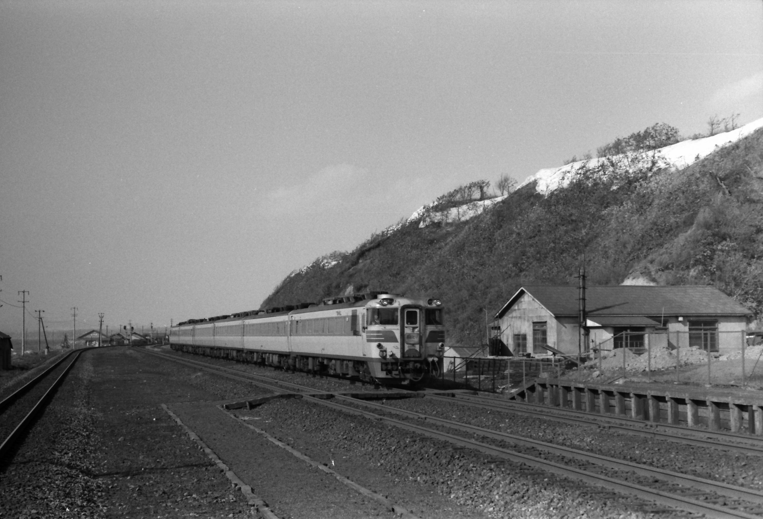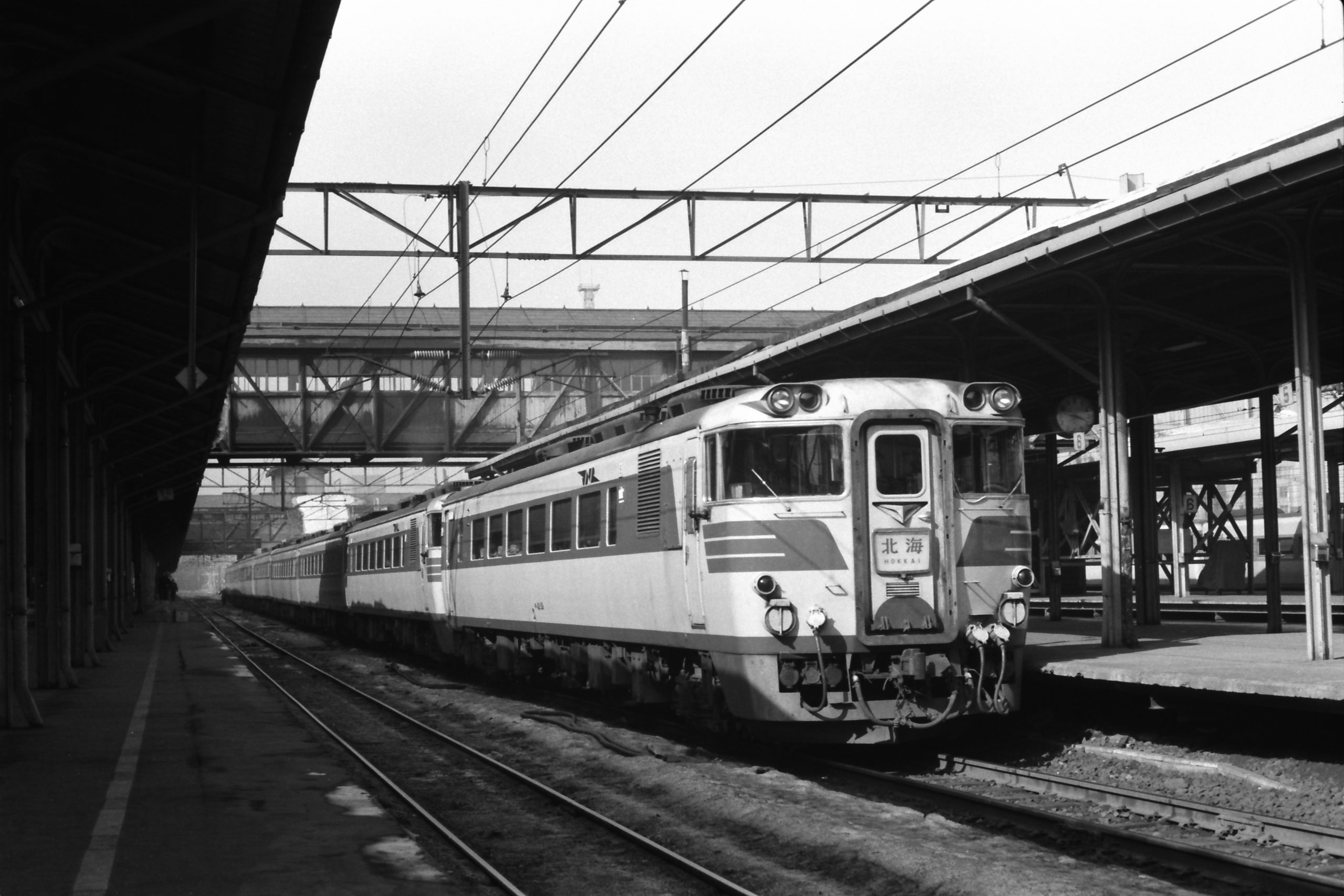 北海道合宿も最終段階。礼文発12時56分の229列車に乗車、道都札幌を目指す。途中、黄金駅で2本の特急列車を退避、1本と行違う。ダイヤでは先に「おおぞら」が通過するはずだが、少し遅れていたのか「北斗」が先にやって来た。この後ネガには東室蘭と思しき駅で撮ったC57のコマがあるが、逆光の酷い写真なので掲載は遠慮させていただいた。なお、229列車は苫小牧から室蘭本線を岩見沢方面に抜けて行くので、我々は多分東室蘭から急行「ちとせ5号」に乗り換えて札幌に向かったものと思われる。東室蘭から札幌方面へ行く次の列車は1231D小樽行きで、それだと札幌着が19時26分と大分遅くなるからである。ただし、例によって記憶はないから本当のところはわからない。
