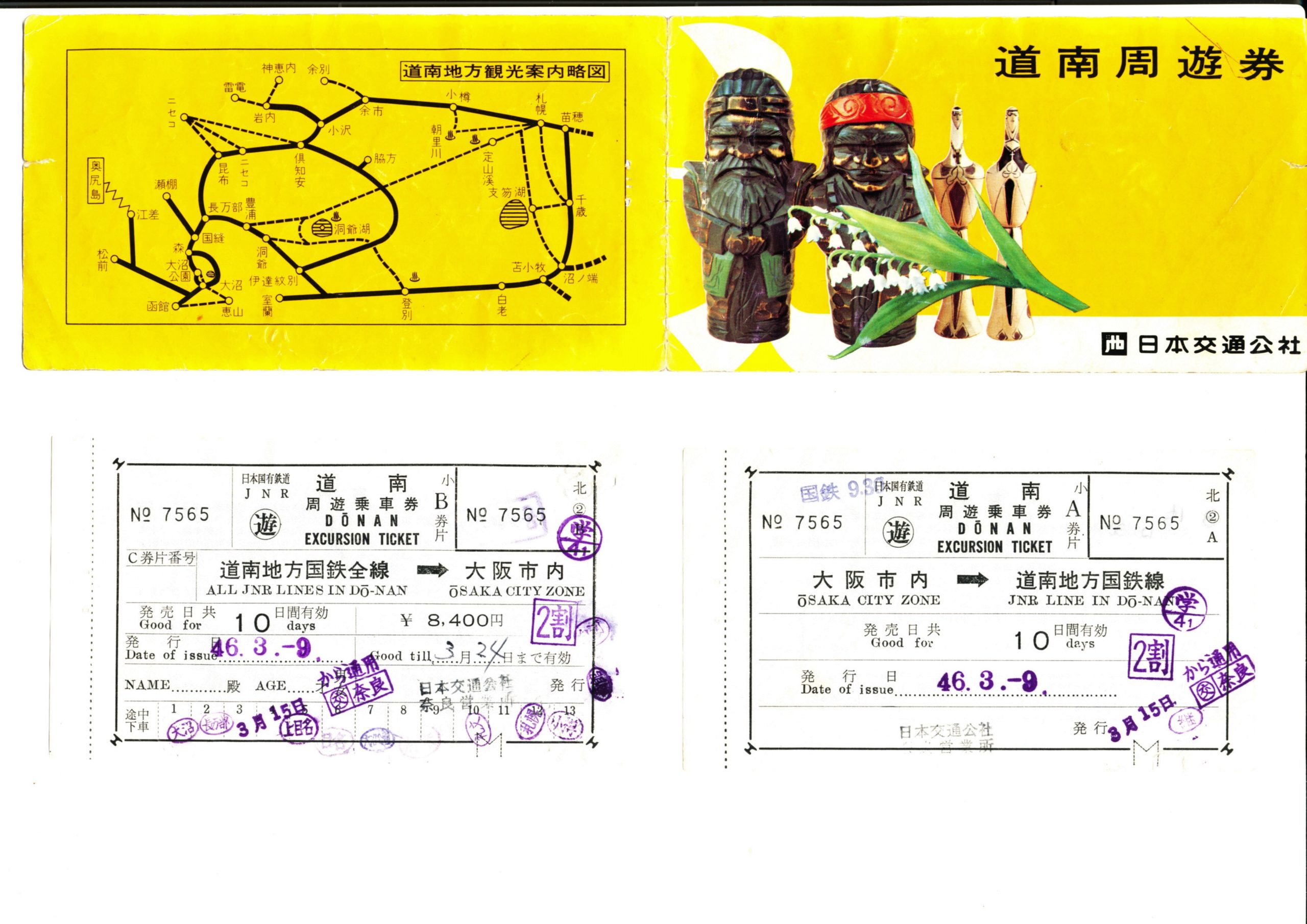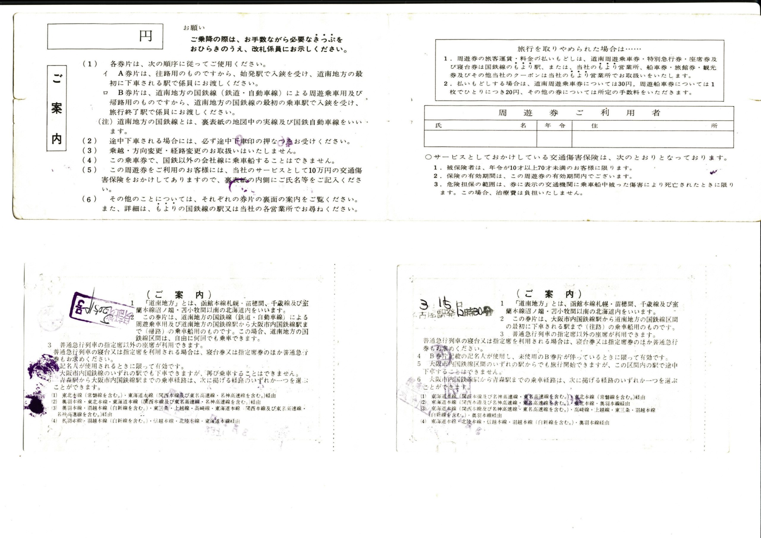 昭和46年3月 我が青春の北海道合宿記 使用した切符 鉄道旅行表紙と切符 2022.06.29 投稿内容: 合宿の時に使った道南周遊券 追加投稿画像: タイトル: 表紙と切符の裏側キャプション: 「名古屋発12時30分」とあるのは東名高速の国鉄特急バスの発車時刻 コメント