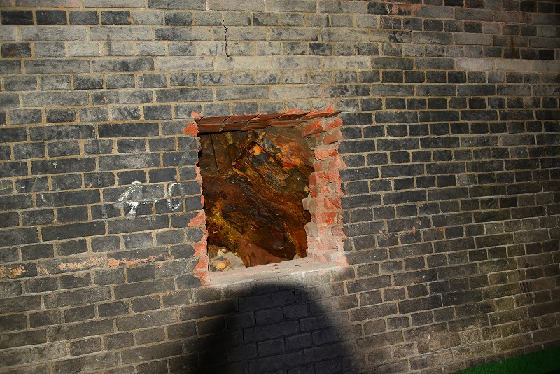 亀の瀬地中レンガ造りの壁の厚さを調べるために開けられた穴
