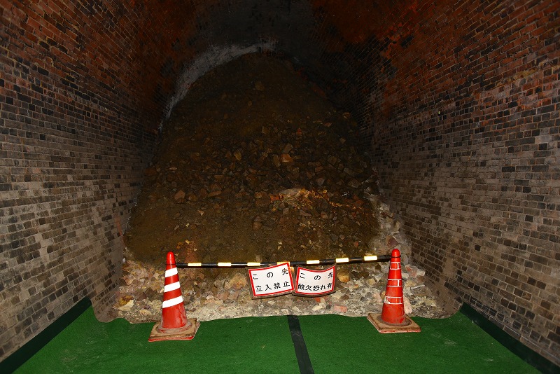 昭和20年11月13日、排水トンネル掘削工事中に、掘削機がレンガと当たり、それを取り除くと、亀の瀬トンネルが現れました。トンネル内部の一部は崩壊していないことから、翌年の12月2日からその部分が公開され、亀の瀬トンネルの遺構を見ることができるようになりました。