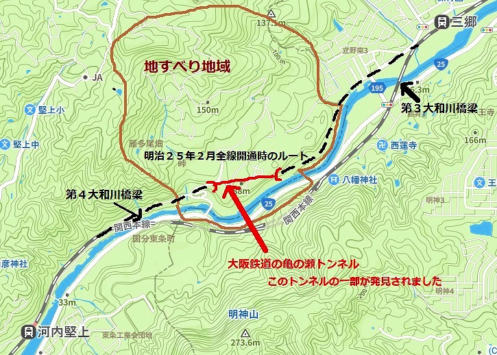 昭和6年から8年にかけて起こった大きな地滑りは、関西本線の亀の瀬トンネルを崩壊させました。そのため、汽車が通れず、1kmほど歩いて乗り継いだそうです。国鉄は、これを機に、地すべりの東と西に大和川を跨ぐ、第3大和川橋梁と第4大和川橋梁を作って地すべり地域を避け、大和川対岸へ線路を移設しました。それが現在のルートです。