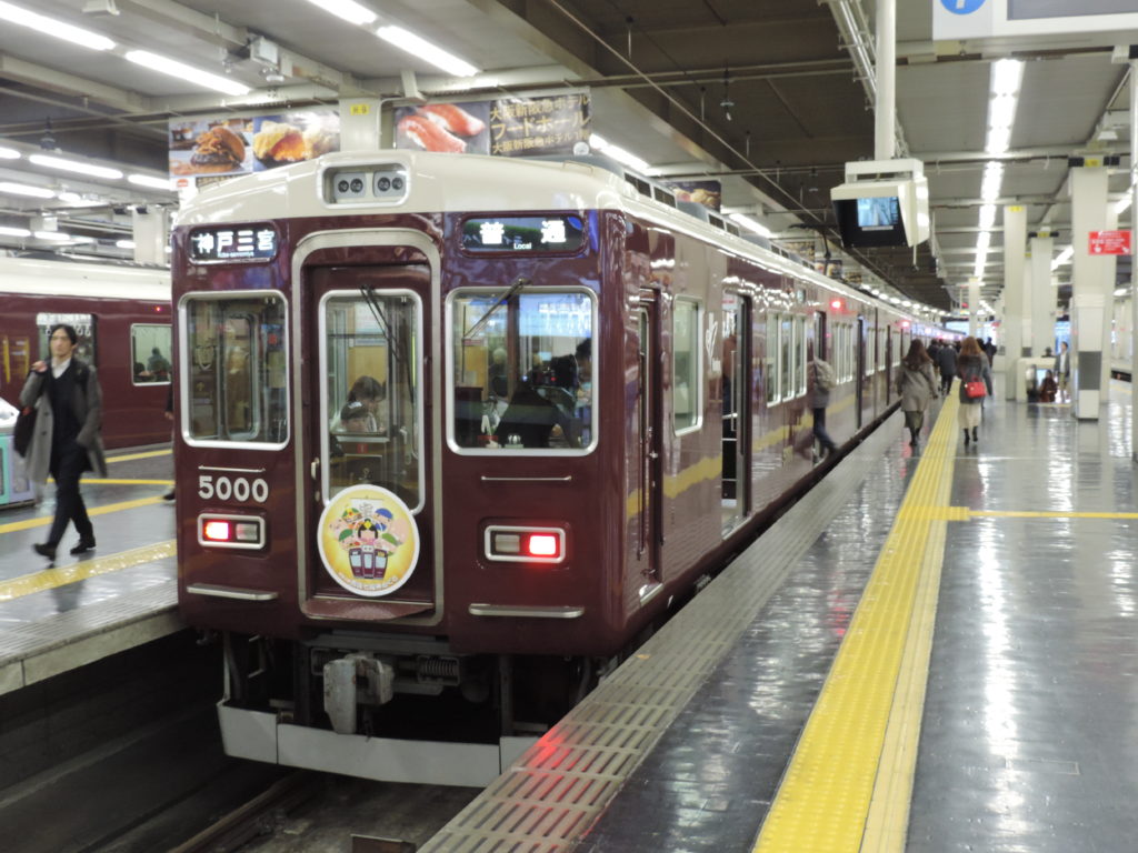 1/2 偶然、阪急大阪梅田駅に(原君によると最近走っていない)神戸線の唯一、1本になった5000系が止まっていました。