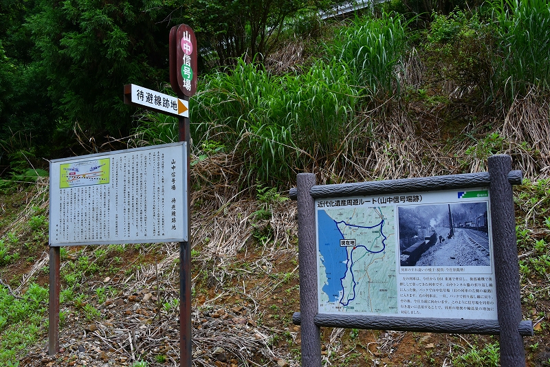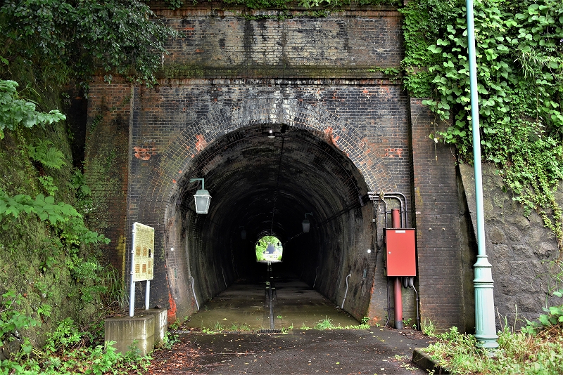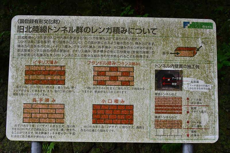 旧北陸本線を訪ねて その2 敦賀~今庄 -杉津線- 廃線巡り山中信号所の敦賀方にある山中トンネル(右側)左が折り返し線で、奥に、有効長延伸のためのトンネルが見えます。 2023.06.202023.07.03 敦賀を出発して最初のトンネルが、この樫曲トンネル(87m)です。レンガでつくられています。レンガの積み方の説明看板がありました。 レンガの積み方の説明版。この樫曲トンネルは、下がイギリス積みで、上部のアーチ部分は長手積みです。 葉原トンネルの敦賀側の登り坂です。先の葉原トンネルの上の部分しか見えません。登っていることが分かります。25‰の坂です。 2番目は、葉原トンネル(979m)です。信号機が設置されています。それなりの長いトンネルです。 3番目は、鮒ヶ谷トンネル(64m)です。一番短いトンネルです。 4番目は、曽路地トンネル(401m)です。少し曲がっていますが、出口が見えます。 5番目が、第一観音寺トンネル(82m)です。曾路地トンネルよりも曲が小さく、長さも短いです。 第一観音寺トンネルの手前、敦賀方を見ると、25‰の勾配が分かります。長い上り坂です。 6番目は、第2観音寺トンネル(310m)です。入口付近は、少し曲がっていますが、進入すると直線になり、出口が見えます。 7番目は、曲谷トンネル(260m)です。このトンネルも曲がっていますが、中に入ると出口が見えます。 8番目は、芦谷トンネル(223m)です。直線で短いトンネルです。工事中のため、信号機が設置されていました。 9番目は、伊良谷トンネル(467m)です。出口確認ができないので、信号機が設置されています。3分の待ち時間です。 10番目が、山中トンネル(1170m)です。敦賀側です。交互通行の信号が設置されていません。トンネルは直線ですが、1170mと長いこともあり、出口が確認できません。対向車が来ないか不安でしたが、幸い対向車もなく通り抜けることができました。トンネル内は、上から水が降り注ぐところが何か所もあったうえ、靄がかかって先が見えずらかったです。トンネル内の空気が変わったことで峠であることを感じさせてくれました。 山中トンネル(1170m)の今庄側です。 山中信号所の説明版です。 山中信号所のスイッチバックです。右が本線で今庄方を見ています。25‰の勾配が分かります。本線の左に待避線が、下りと上り用の2本分あったことをうかがわせる幅の広いスペースがありました。その先、遠くにロックシェッドが見えます。 待避線のロックシェッドが上下線用の2つあることが分かります。まだ残っているのに感動しました。 山中信号所から25‰の坂を下っていくと、右手に大桐駅跡がありました。ホームの上に車輪などのモニューメントが置かれてありました。 コメント 名前:塚本 勝美 : 投稿日:2023/06/20(火) 17:15:48 ID:AyOTkzNzU 旧北陸本線の廃線巡りの後半その2を、トンネルを主に投稿しました。 この廃線跡は、たくさんの人がネットで紹介されています。それらも見ていただいて訪ねようと思われる方は、行かれたら良いかと思いますが、車でしか行けません。歩けないトンネルがあります。 この敦賀と今庄の間には、眺めの素晴らしい、杉津付近から敦賀湾を望めるところもありましたが、下り列車にとっては、敦賀からの25‰の急な上り坂の連続と、多くのトンネルで過酷な区間であったことが分かります。特に、山中トンネルの手前に短いとはいえ3つのトンネルが連続して存在し、最後が長い山中トンネルとは・・・。過酷であったことがよく分かります。 返信