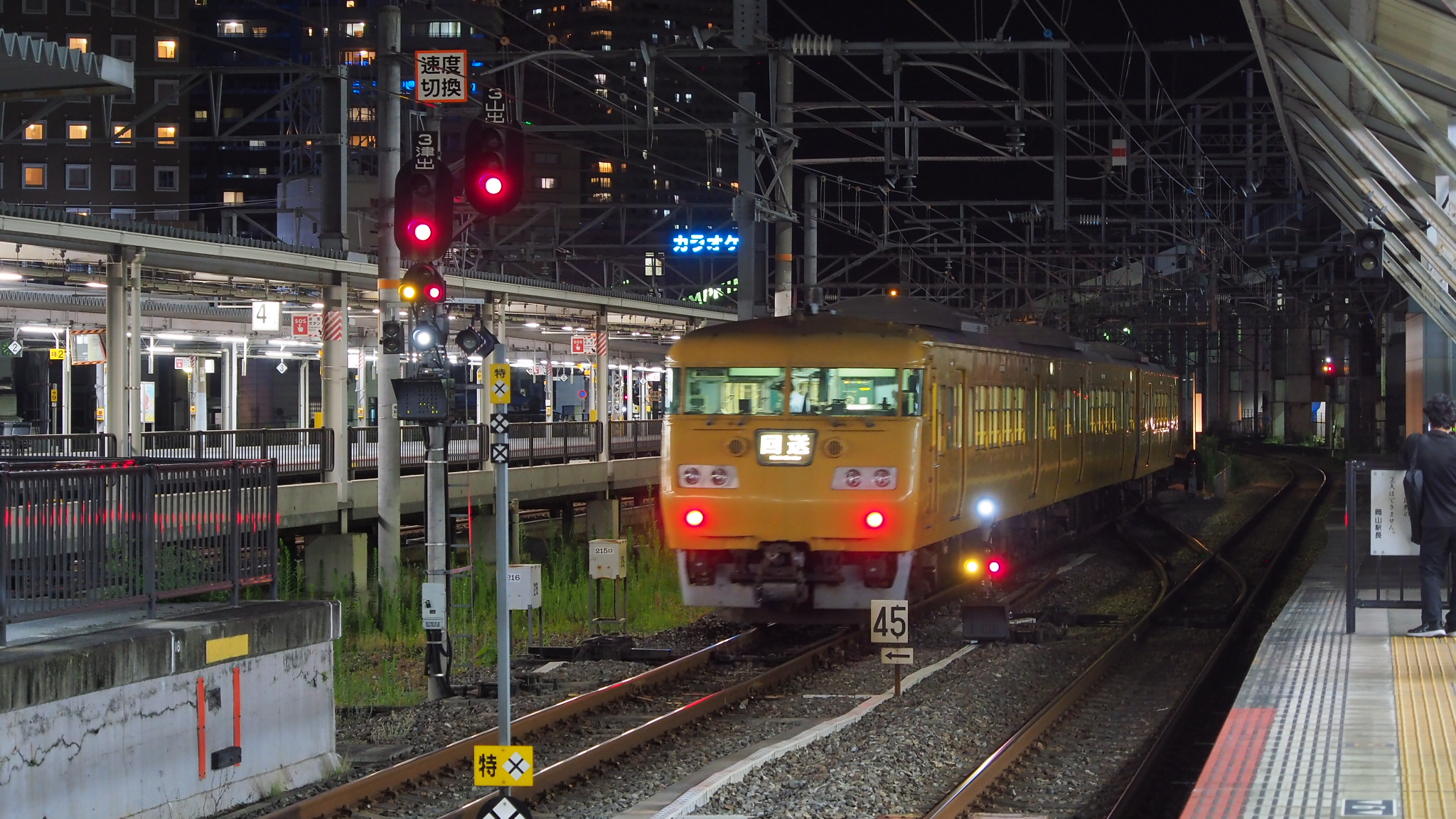 • 7/21(金)に、多くのファンに惜しまれながら「引退」した117系が7/29(土)「尾道花火大会」の観客輸送に抜擢されました。列車は1751M(岡山発16時25分)→442M(岡山着22時35分)で岡山駅到着場面の撮影です。幕が回送になってしまって残念です。