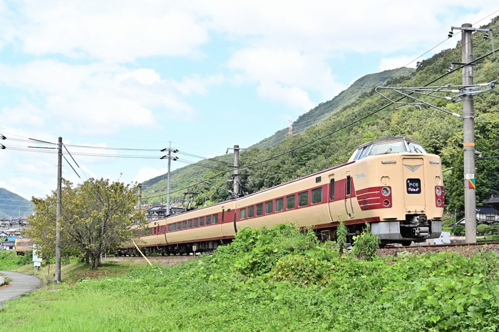 木野山駅近くの橋梁で撮影した国鉄特急色の381系特急「やくも9号」の後追い撮影写真です。