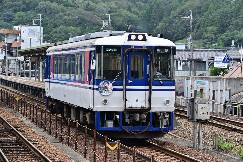 智頭鉄道のHOT3500形3509号車 作用駅を智頭駅に向けて発車していきます。「鉄道むすめ」の看板を掲出しています。