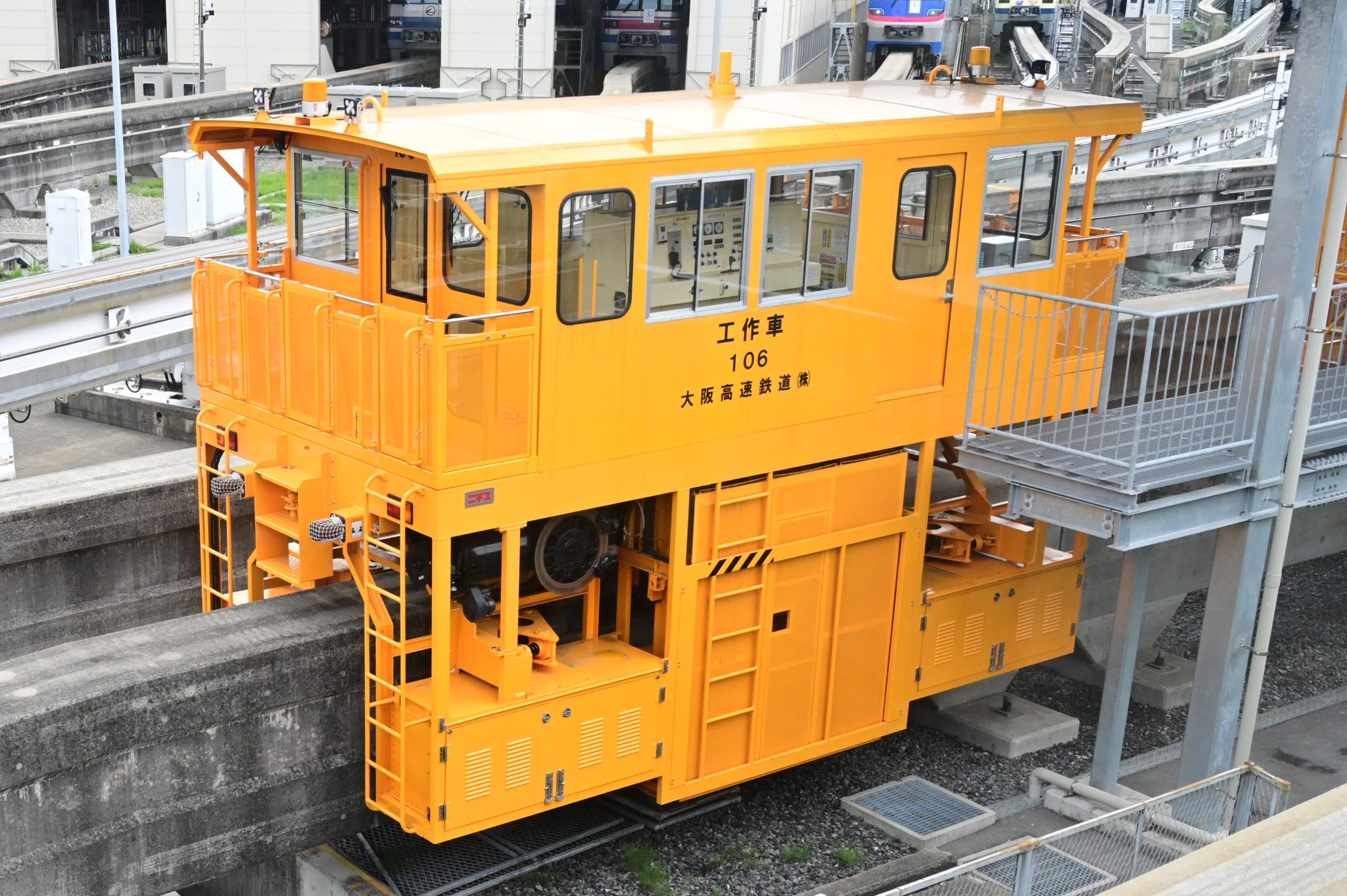 そこで、「大阪高速鉄道」と表記されるものを探しに出掛け、本社の入口にある社名表記と、万博車両基地に留置されている「工作車」を撮影しました。103号は柵の隙間から撮ったので画像を高倍率でトリミングしています。一方、106号の方は他の乗客から奇異の目で見られながら、車内から撮影しました。