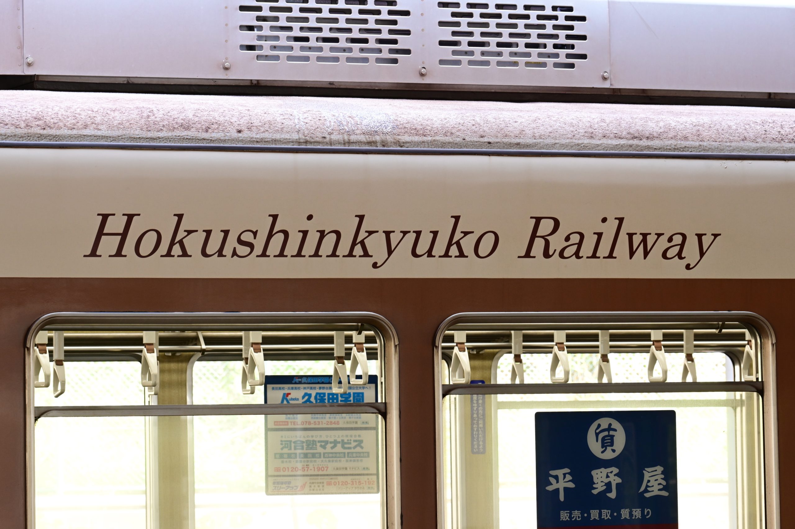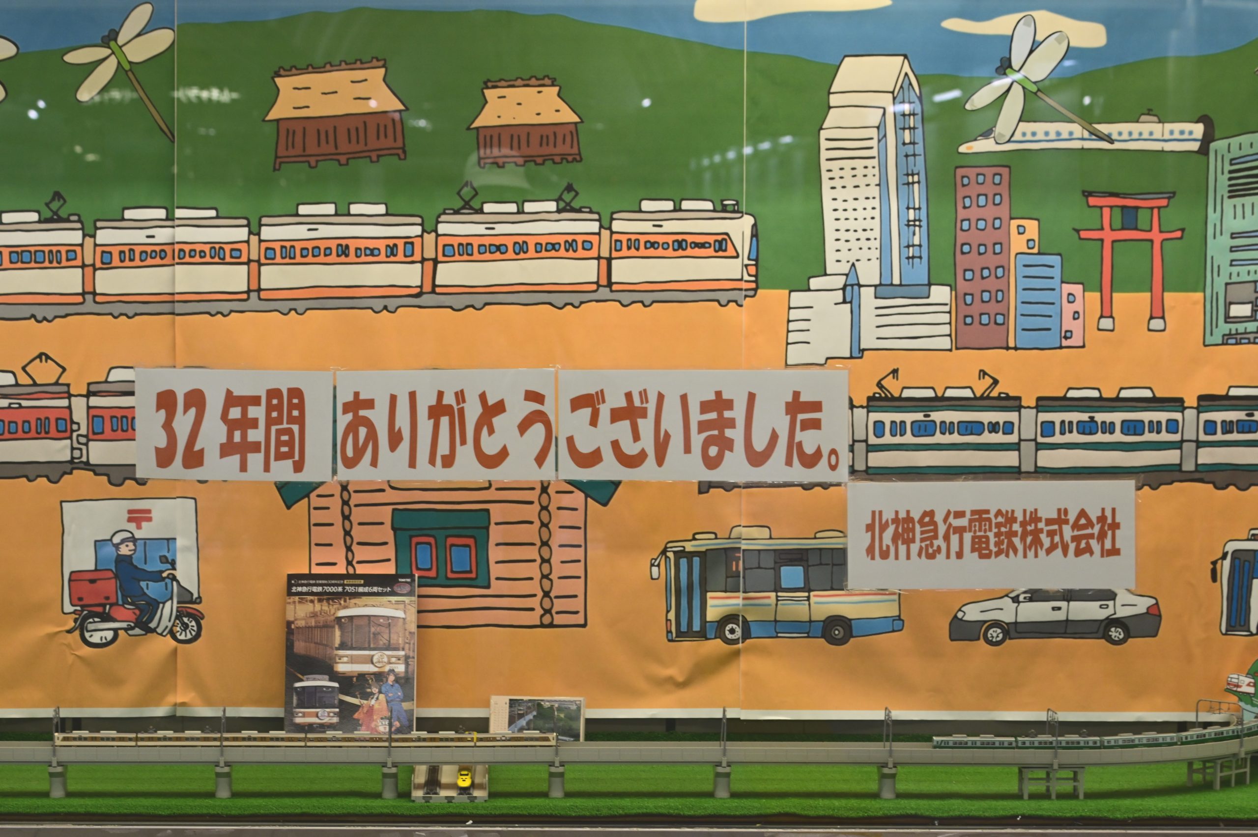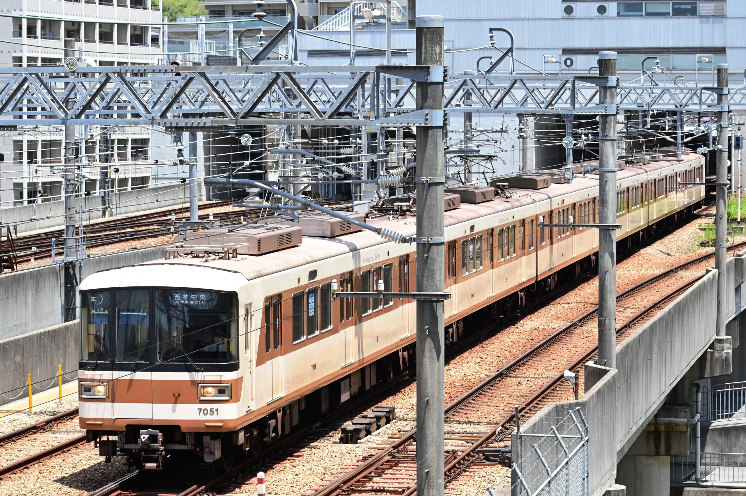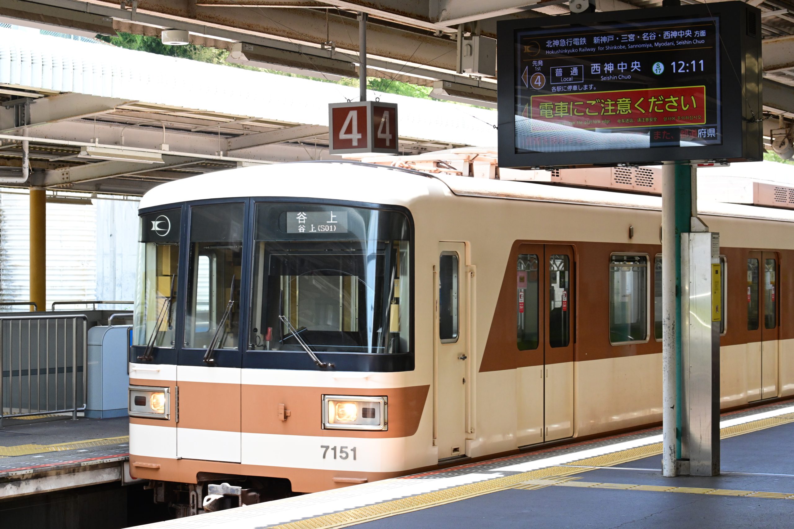 次は6月1日に神戸市営地下鉄北神線になる北神急行電鉄を見に行きました。「北神急行」の表示はあちこちに見られますが、車両と一緒に撮ろうとすると、なかなか難しくて、「北神急行電鉄」と小さく記された谷上駅の発車標を入れて北神7000-A系の入線を撮ると、急いで小高い場所へ移動し7051×6が出発するところを撮りました。その後、